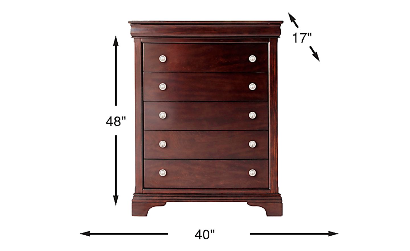 Providing a timeless look, the Hydeville chest showcases classic, traditional style. Crafted of birch veneers, this piece is finished in a rich brown color. Beautiful frame moulding and silver-finished metal knobs add distinguished details. For abundant storage, this chest includes five spacious drawers to keep clothes and blankets neatly organized. A hidden jewelry tray at the top allows you to inconspicuously store valuable items.