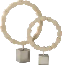 Elevate your space with our captivating Ibreu ring sculptures, meticulously crafted from multiple sizes of unique cast ivory man-made stone, resembling the timeless beauty of travertine. Each piece is elegantly elevated on brushed nickel metal bases, exuding modern sophistication and artistic charm. Sizes S- 13x17x13, L- 17x23x17. Customer assembly is required.