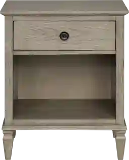 The nightstand features a hand-applied gray finish with a visible wood-look grain that provides the warmth of natural timber with enhanced surface consistency. While the finish is designed for everyday use, we recommend following our expert care advice by using coasters to prevent moisture rings and cleaning the surface with a soft, dry cloth to preserve the hand-applied detail over time.