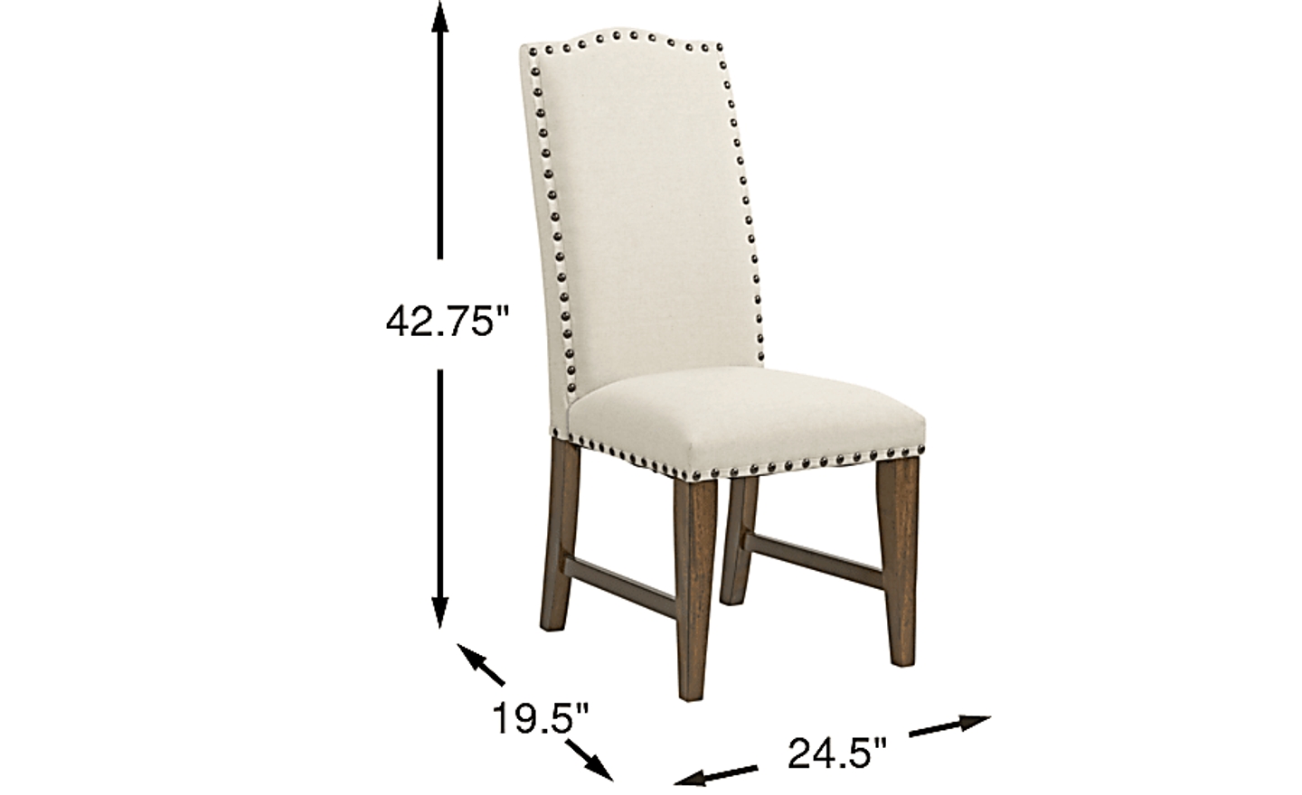 Set a place at the table for sophisticated seating with the Industrial Court side chair. This chic perch, easily able to complement a variety of home decor, is upholstered in linen style oatmeal colored fabric. Nailhead trim in a gray color adds a beautiful refinement while tapered legs in a rich brown finish provide support.