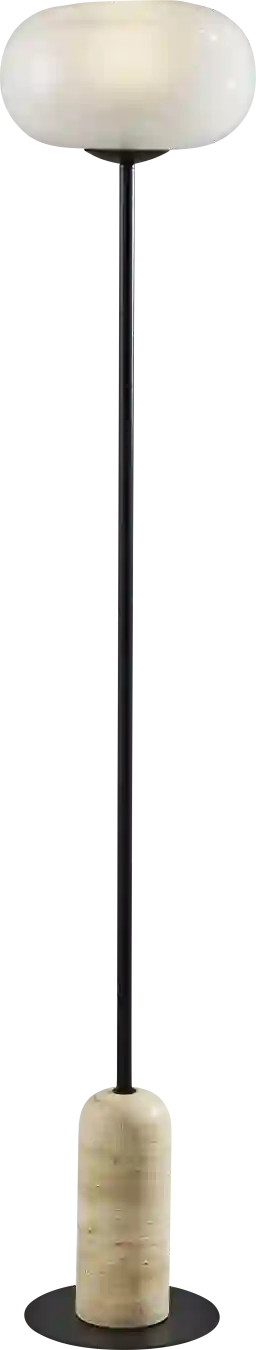 Introducing the Ines Land Black Floor Lamp, a stunning blend of contemporary design and natural elements that adds sophistication to any room. Featuring a sleek black finish and a white glass shade, glossy on the outside and frosted on the inside, this lamp creates a warm and inviting glow. The chunky travertine stone base adds a rustic, organic texture, perfectly complementing the modern design. This lamp provides both style and convenience, making it a versatile lighting solution for any space. Partial assembly may be required.