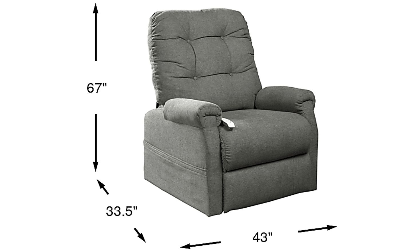 The Ingram lift chair recliner is perfect for those who need extra assistance to safely rise from a chair. Upholstered in pebble gray knitted fabric, this three position lift chair offers quiet power reclining and lift accessed at the push of a button. The easy touch button hand held wand remote features a USB port for charging electronic devices. Built-in storage pockets on each side gives you a spot to store items right at your fingertips. Integrated battery backup ensures continued operation during a power outage. Crafted using furniture grade hardwood/plywood construction for durability, sinuous wire seating offers strength and uniform support up to 325 lbs. Delivery is to the front door only. Limited assembly is required but not included. This lift chair meets or exceeds all quality standards for design and manufacturing of medical devices and funding. Rooms to Go, however, does not participate in seeking reimbursement for customers. 100% Polyester. Delivery is to the front door only; inside home delivery and set up is not available. Limited assembly is required but not included. Seat width is 18".