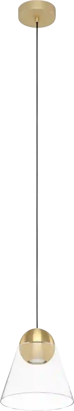 Add a touch of glamorous style and warm overhead lighting to your interiors with the Inlyne Club pendant. With the brushed brass accent holding the integrated light source surrounded by the clear glass cone shaped shade adds a touch of luxe appeal while brining extra opulence when the light shines through. The adjustable black hanging cord and brushed brass canopy add the finishing touches to this pendant. Professional installation by an electrician is recommended.