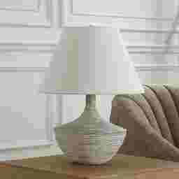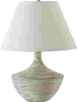 Where vintage charm meets contemporary design, the Intervale Bay Ivory Lamp features a charcoal ceramic base with stone ivory ribbed overlay and heavy distressing. Enhanced with brushed nickel-plated details, this lamp adds a touch of modern refinement to any space. The round hardback shade is covered in a light beige linen fabric. Partial assembly may be required.