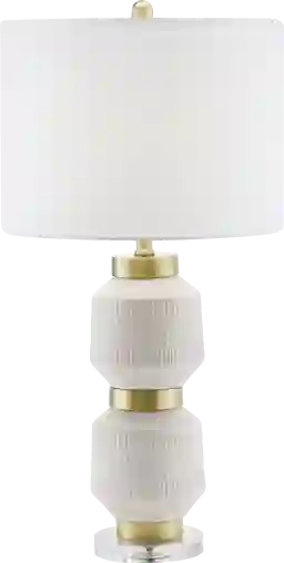 The Iola Circle lamp features a stacked ceramic body that blends quality materials with elegant hues for a lamp that lights up any decor with its magnificent appeal. It features a creamy white finish textured blocks, soft gold metal accents, and clear crystal base which completes the look of glam. The lamp topped with a clean white hardback drum shade. Partial assembly may be required.