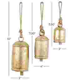 Designed with rugged beauty and an earthy charm, where natural simplicity, warmth, and organic materials create a wholesome atmosphere. The Irdan indoor/outdoor decorative cow bells set is crafted from iron and jute rope materials, ensuring both durability and style. The cylindrical bells hanging on a rope set is designed with a satin gold finish and a brown jute rope for a rustic appeal. This metal set of 3 decorative cow bells features round bells in varied sizes, suspended from hemp ropes and equipped with metal clappers, adding a touch of sound to any space. Each gold metal decorative cow bells measures 5L x 5W x 10H, 4L x 4W x 7.50H, 3L x 3W x 5.50H inches, and collectively weighs 2.93 lbs.