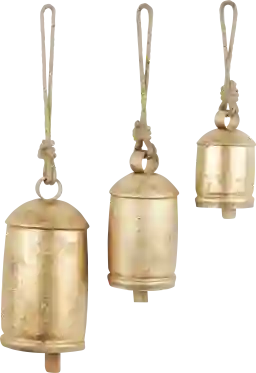 This set is expertly crafted from a combination of durable iron and natural fiber ropes, designed to provide a "rugged beauty" and earthy charm. The bells feature a sophisticated satin gold finish, while the suspension is provided by sturdy jute and hemp ropes, ensuring a blend of organic simplicity and long-lasting style.