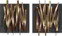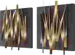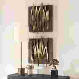 The crosshatch panels in the Irena wall decor bring contemporary flair with a fun three dimensional iron design finished in antique gold. Set on a naturally finished walnut veneer background.