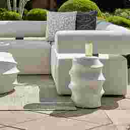 This Isadi accent table showcases the inherent beauty of glass reinforced concrete while the casual white finish complements the organic, undulating and wavy design that feels contemporary and timeless. Suitable for both indoor and outdoor use.