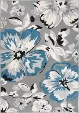 When styling contemporary spaces, look for designs that balance bold motifs with a neutral palette. This rug features a floral pattern in sophisticated blue, gray, white, and black tones, making it a versatile anchor. The cool color family allows it to blend seamlessly with modern gray or navy upholstery while the organic floral shapes soften the clean, sharp lines often found in contemporary furniture.