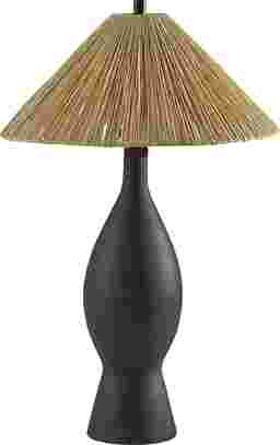 Introducing the Isham Shores Black Lamp, a striking blend of natural texture and modern design. Featuring an hourglass-shaped rough-finished black ceramic base, this lamp adds a bold, rustic touch to any room. The tapered raffia grass shade complements the base with its organic texture, creating a warm, inviting glow. Standing at 28 inches tall, it's the perfect addition to living rooms, bedrooms, or entryways. Partial assembly may be required.