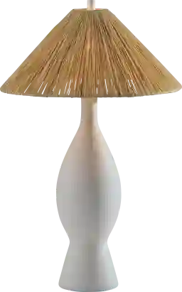 Introducing the Isham Shores White Lamp, a perfect blend of organic textures and contemporary design. Featuring an hourglass-shaped rough-finished white ceramic base, this lamp brings rustic elegance to any space. The tapered raffia grass shade enhances the natural aesthetic, casting a warm and inviting glow in your room. Standing at 28 inches tall, this lamp is an ideal addition to living rooms, bedrooms, or entryways. Partial assembly may be required.