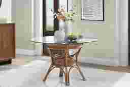 The breezy, relaxed charm of a serene beachside resort comes naturally with the Isla Bay collection, creating a space that feels light, welcoming, and effortlessly pulled together. Classic coastal in style, this 48-inch round dining table is crafted from 100% natural rattan in a warm brown finish for rich texture and organic character. A clear glass top keeps the look airy while showcasing the woven rattan details below, anchored by a sculptural leg base.