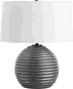 The Isolde Park Bronze Lamp features a ribbed ceramic base finished in a satin dark bronze glaze accented with matching dark bronze hardware. A white linen round hardback shade completes the piece. Partial assembly may be required.