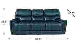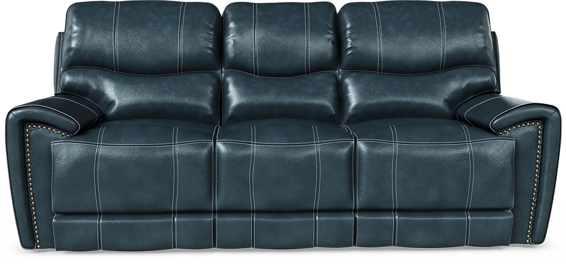 With its sleek transitional design and padded frame, the Italo reclining sofa is a trendy yet versatile place to get comfortable. Offering innovative Power Plus reclining capabilities, it has everything you need to relax. At the push of a button, chaise recliners on each end extend or stop smoothly at your desired position. Each side features a USB port, allowing you to charge a cell phone or tablet. Upholstered in luxurious top grain leather where the body touches, heavy coordinating stitching details complement the rich blue color. Flared arms are trimmed in copper nailheads for a polished accent. Upholstery: Top grain leather where the body touches and polyurethane fabric sides and backs.