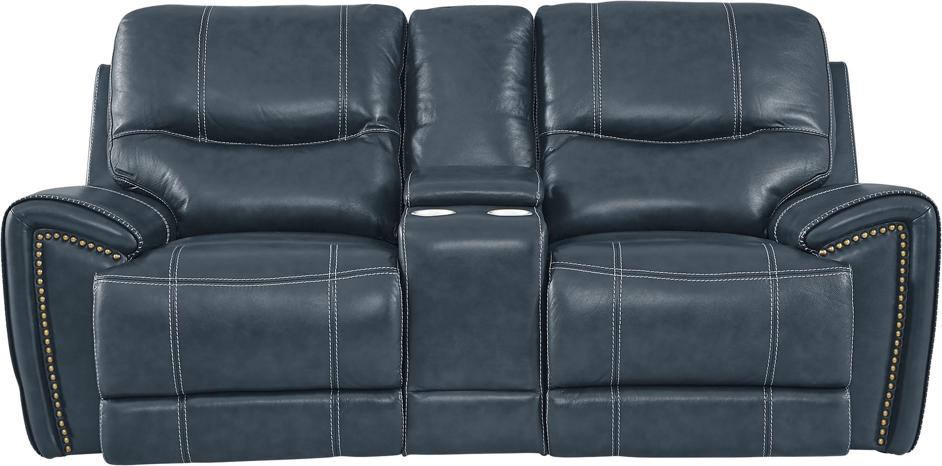 The Italo reclining console loveseat gives you a comfortable seating experience for two. Luxurious top grain leather where the body touches in a rich blue color is versatile, easily blending into many types of decor. At the push of a button, the back and feet smoothly extend, allowing each person to individually control their preferred reclining experience. A center console features lift top storage and two cupholders, while each side of this loveseat features a USB port for charging electronic devices. Crisp flared arms add a contemporary touch with copper nailheads. Top Grain Leather Where the Body Touches and Polyurethane Fabric sides and backs.