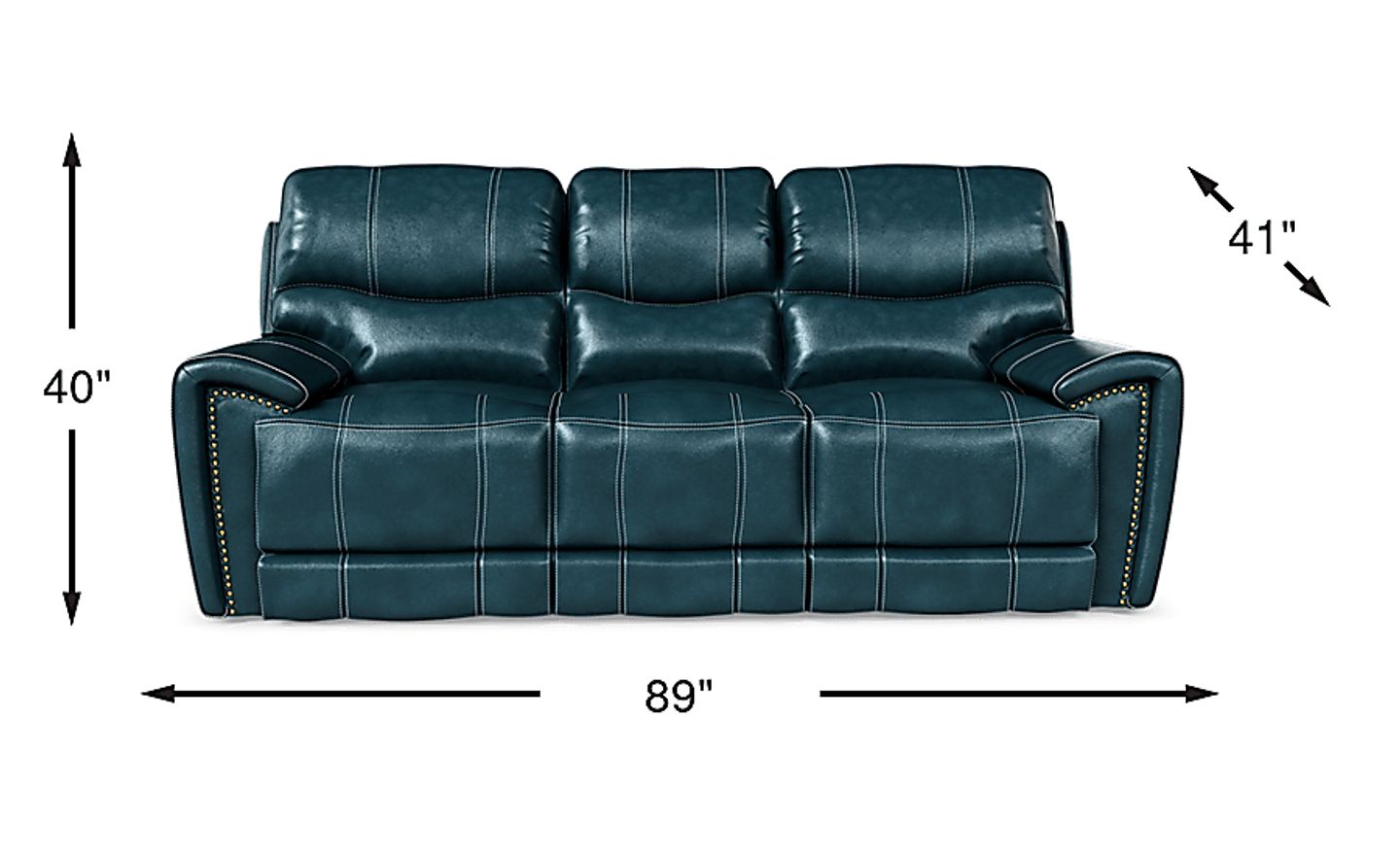 With its sleek transitional design and padded frame, the Italo reclining sofa is a trendy yet versatile place to get comfortable. Offering innovative Power Plus reclining capabilities, it has everything you need to relax. At the push of a button, chaise recliners on each end extend or stop smoothly at your desired position. Each side features a USB port, allowing you to charge a cell phone or tablet. Upholstered in luxurious top grain leather where the body touches, heavy coordinating stitching details complement the rich blue color. Flared arms are trimmed in copper nailheads for a polished accent. Top Grain Leather Where the Body Touches and Polyurethane Fabric sides and backs.