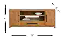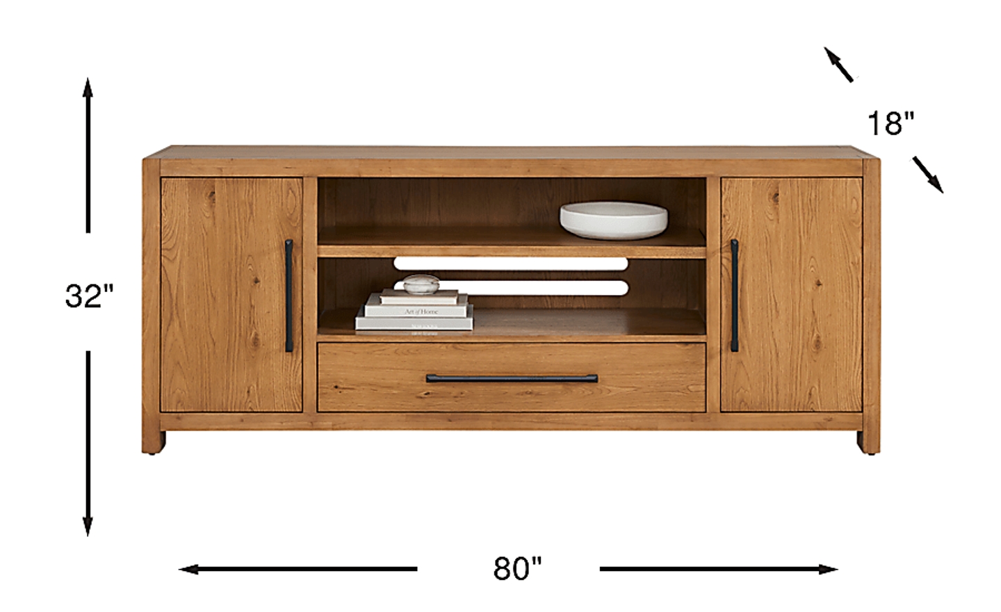 The sleek allure and refined charm of the Ithaca entertainment console transforms your living space into a stylish hub of cinematic luxury. Oak veneers in a natural finish add a sublime final polish to this 80-inch transitional accent, with metal bar pull hardware in a black finish to even the look out. Each wing of the console is equipped with doors that conceal adjustable shelving to support your organization goals. Designed for convenience, the open cubby features a sleek pass-through cutout for easy cable management, keeping your streaming devices neatly arranged and clutter-free. The drawer underneath is joined with English and French dovetails for enhanced durability.