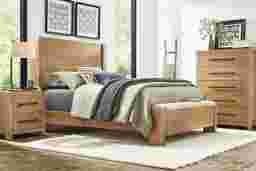 The shining vibrancy and modest sophistication of the Ithaca bedroom turns your sleep space into a relaxing center of staycation luxury. Constructed with oak veneers in a natural finish, the bed features horizontal paneling with a framed motif that adds a handsome minimalistic aesthetic. A bench on the footboard provides a welcome seating option as well. Matching pieces include metal bar pull hardware in a black finish for an elevating contrast. USB ports in the nightstand add convenient charging. Mattress and foundation (if required) sold separately.