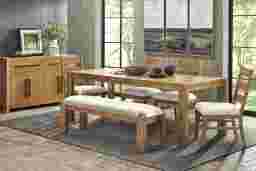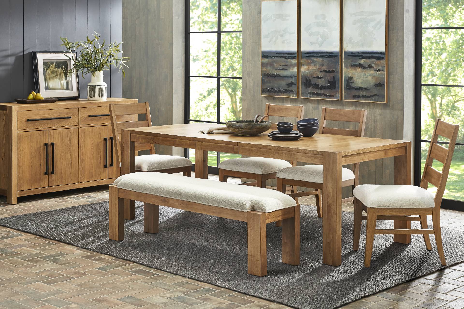 A shining vibrancy with modest undertones of urban sophistication in the Ithaca dining room welcomes Zen-like luxury into your space with a simple smile. Constructed with oak veneers in a natural finish, the 72" rectangular tabletop extends to 90" with an included leaf to accommodate larger parties. Four large legs give this piece an impressive presence that balances perfectly with its subtle aesthetic. Each side chair features a ladder back and an upholstered seat in beige, its soft fabric complementing the gentle curve of the frame. The included bench provides a family-style seating option for added charm and functionality.
