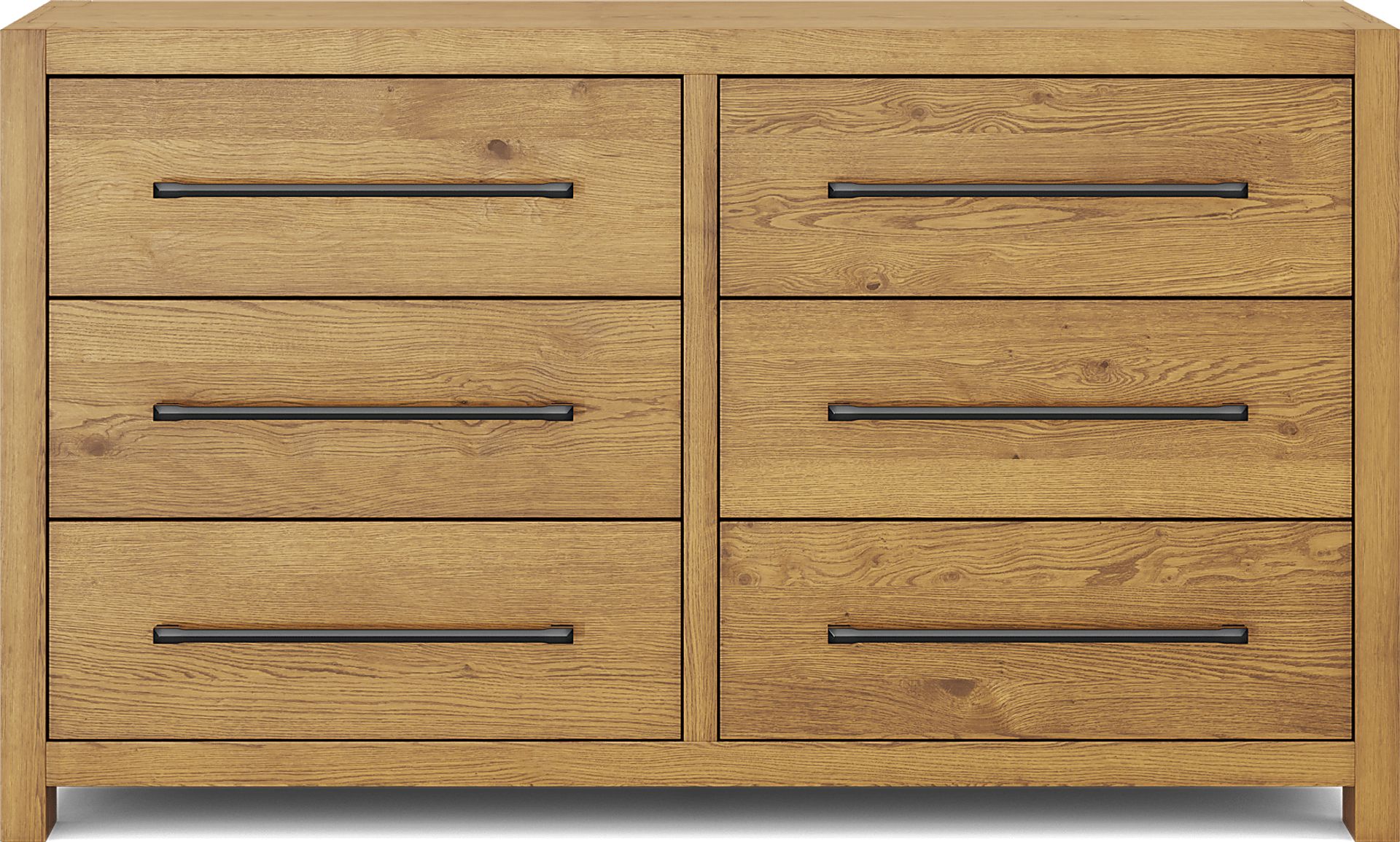 The shining vibrancy and modest sophistication of the Ithaca dresser turns your bedroom into a relaxing center of staycation luxury. Constructed with oak veneers in a natural finish, this contemporary piece features six drawers with French dovetail joints, dustproof bottom drawers, felt-lined top drawers, and side mount, soft closing glides and levelers. Gorgeous metal pulls add an elevating contrast to the piece's overall stylish appearance.