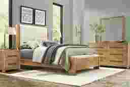 The shining vibrancy and modest sophistication of the Ithaca bedroom turns your sleep space into a relaxing center of staycation luxury. Constructed of wood solids and oak veneers in a natural finish, the bed features a headboard upholstered in beige with a framed motif that adds a luxurious touch to the minimalistic aesthetic. A bench on the footboard provides a welcome seating option as well. The matching dresser includes metal bar pull hardware in a black finish for an elevating contrast. And to complete the look, the included mirror can be mounted to the dresser. Mattress and foundation (if required) sold separately. Bed shown is queen size.