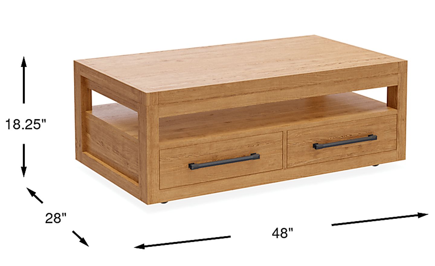 A shining vibrancy with modest undertones of urban sophistication in the Ithaca collection welcomes Zen-like luxury into your space with a simple smile. Constructed with oak veneers in a natural finish, this contemporary cocktail table features a clean rectangular frame and organic wood-grain-like detailing. The lift-top reveals storage space perfectly sized for laptops, books and more. Two bottom drawers provide more space to keep your living space clutter-free and organized. Black metal bar pulls add sleek allure and refined charm, while casters make this accent easy to move and reposition.
