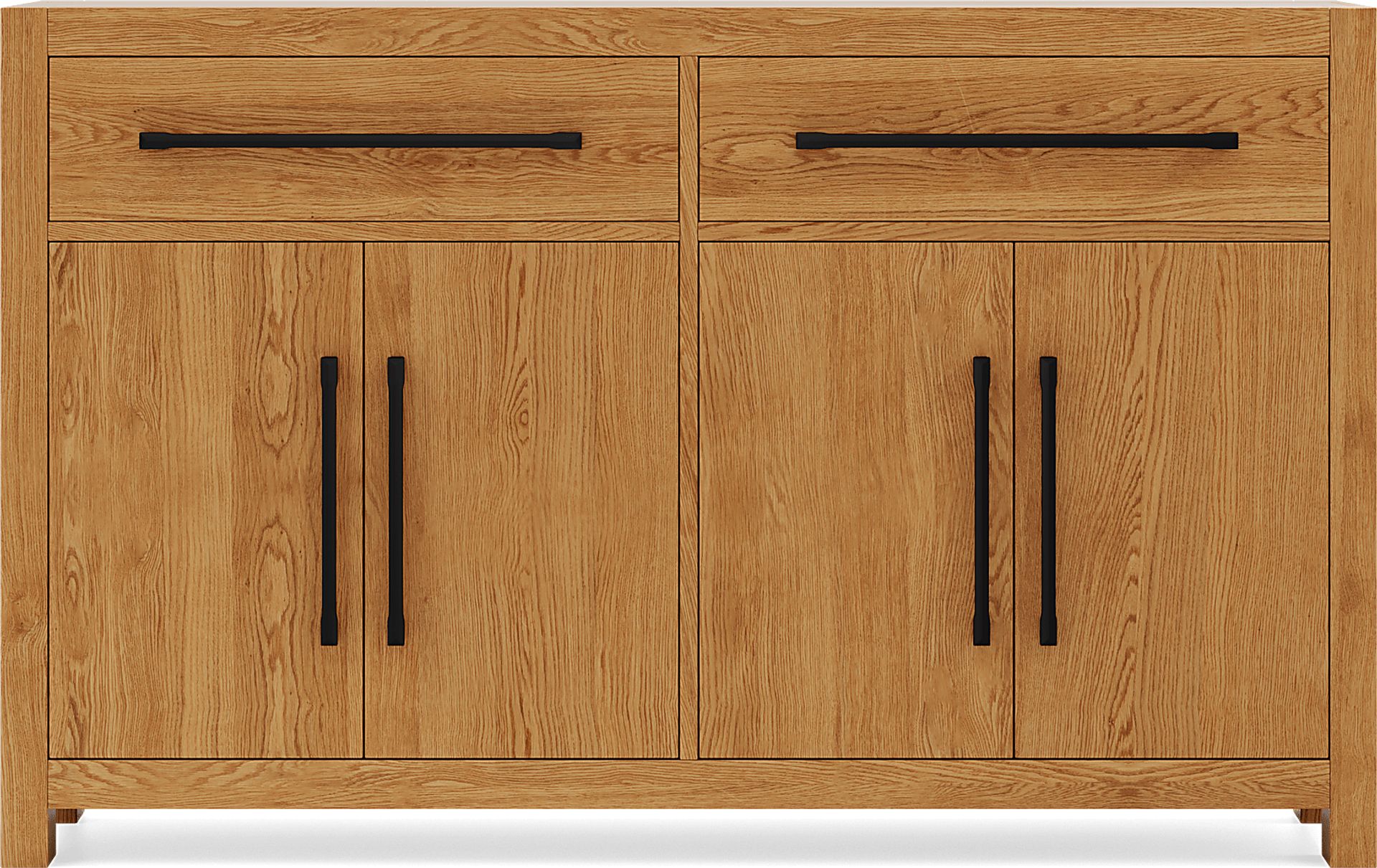 This piece embodies contemporary urban sophistication through its minimalist lines and high-contrast hardware. The combination of the warm, natural light-wood finish and the black metal bar pulls creates a modern aesthetic that pairs well with other neutral-toned furniture. Its understated design allows it to function as a focal point in a dining room or a versatile accent piece in an entryway or living area.