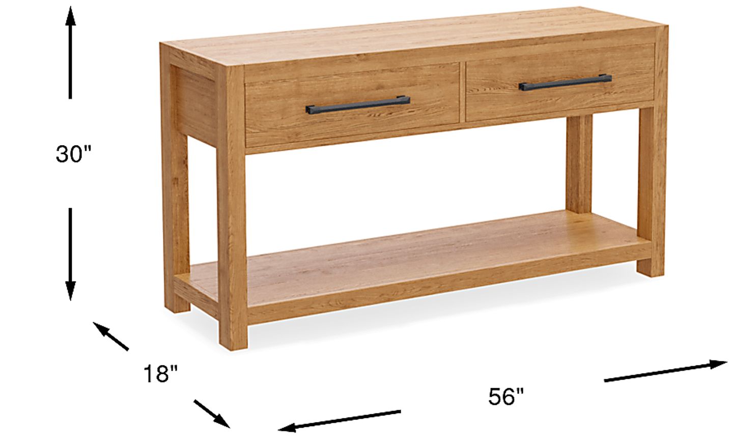 A shining vibrancy with modest undertones of urban sophistication in the Ithaca collection welcomes Zen-like luxury into your space with a simple smile. Constructed with oak veneers in a natural finish, this contemporary sofa table features a clean rectangular frame and organic wood-grain-like detailing. Twp top drawers provide storage space to keep your living space clutter-free and organized, while the bottom shelf offers open display space. Black metal bar pulls add sleek allure and refined charm.
