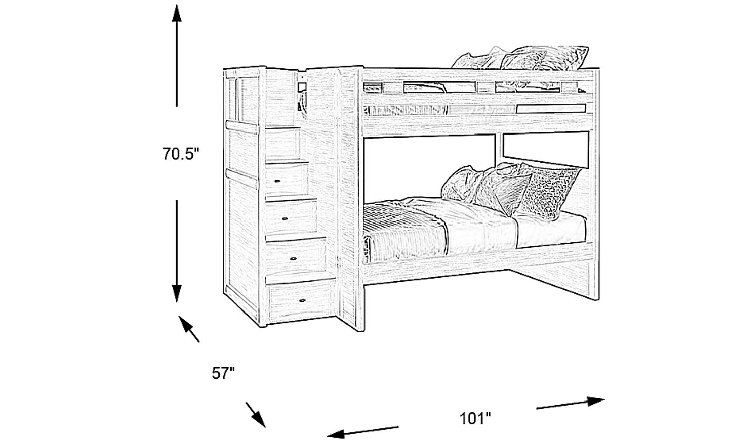This bed stands at a height of 70.5 inches. For optimal safety and comfort, it is generally recommended to have 30 to 36 inches of clearance between the top of the mattress and the ceiling. Given its 101-inch length, we recommend measuring your wall space carefully, as the integrated staircase increases the footprint compared to a standard ladder-only model.