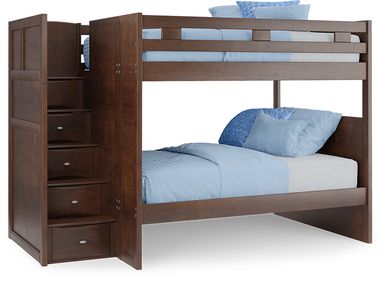 The Ivy League 2.0 step loft makes the most of the space in your child's bedroom. On one side you'll find a storage chest with five beveled drawers and brushed steel hardware and adjustable shelves fronted by a door. The opposite side has steps that lead to a top bunk. Each step has skid resistant textured strips and built-in storage drawers. The twin bottom bed is on casters so it can be moved easily. Durable construction is complemented by a beautiful walnut finish. Mattresses and foundations (if required) sold separately. Bunkie boards required.