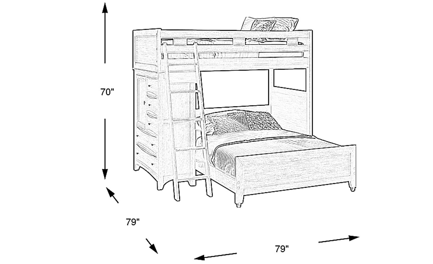 This loft is an exceptional space-saving solution for compact living environments. By integrating a five-drawer chest and adjustable shelving directly into the frame, it eliminates the need for a separate dresser and bookcase. The "Twin over Full" configuration provides a larger sleeping area on the bottom without increasing the overall footprint of the room, making it ideal for maximizing floor space in smaller urban bedrooms.