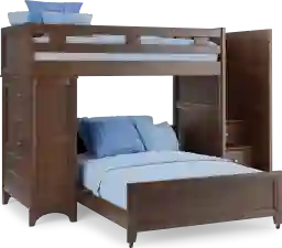 The Ivy League 2.0 twin over twin step loft makes the most of the space in your child's bedroom. On one side you'll find a storage chest with five beveled drawers and brushed steel hardware and adjustable shelves fronted by a door. The opposite side has steps that lead to a twin top bunk. Each step has skid resistant textured strips and built-in storage drawers. The twin bottom bed is on casters so it can be moved easily. Durable construction is complemented by a beautiful walnut finish. Mattresses and foundations (if required) sold separately. Bunkie boards required.