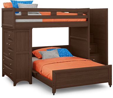 The Ivy League 2.0 twin over twin step loft makes the most of the space in your child's bedroom. On one side you'll find a storage chest with five beveled drawers and brushed steel hardware and adjustable shelves fronted by a door. The opposite side has steps that lead to a twin top bunk. Each step has skid resistant textured strips and built-in storage drawers. The twin bottom bed is on casters so it can be moved easily. Durable construction is complemented by a beautiful walnut finish. Mattresses and foundations (if required) sold separately. Bunkie boards required.