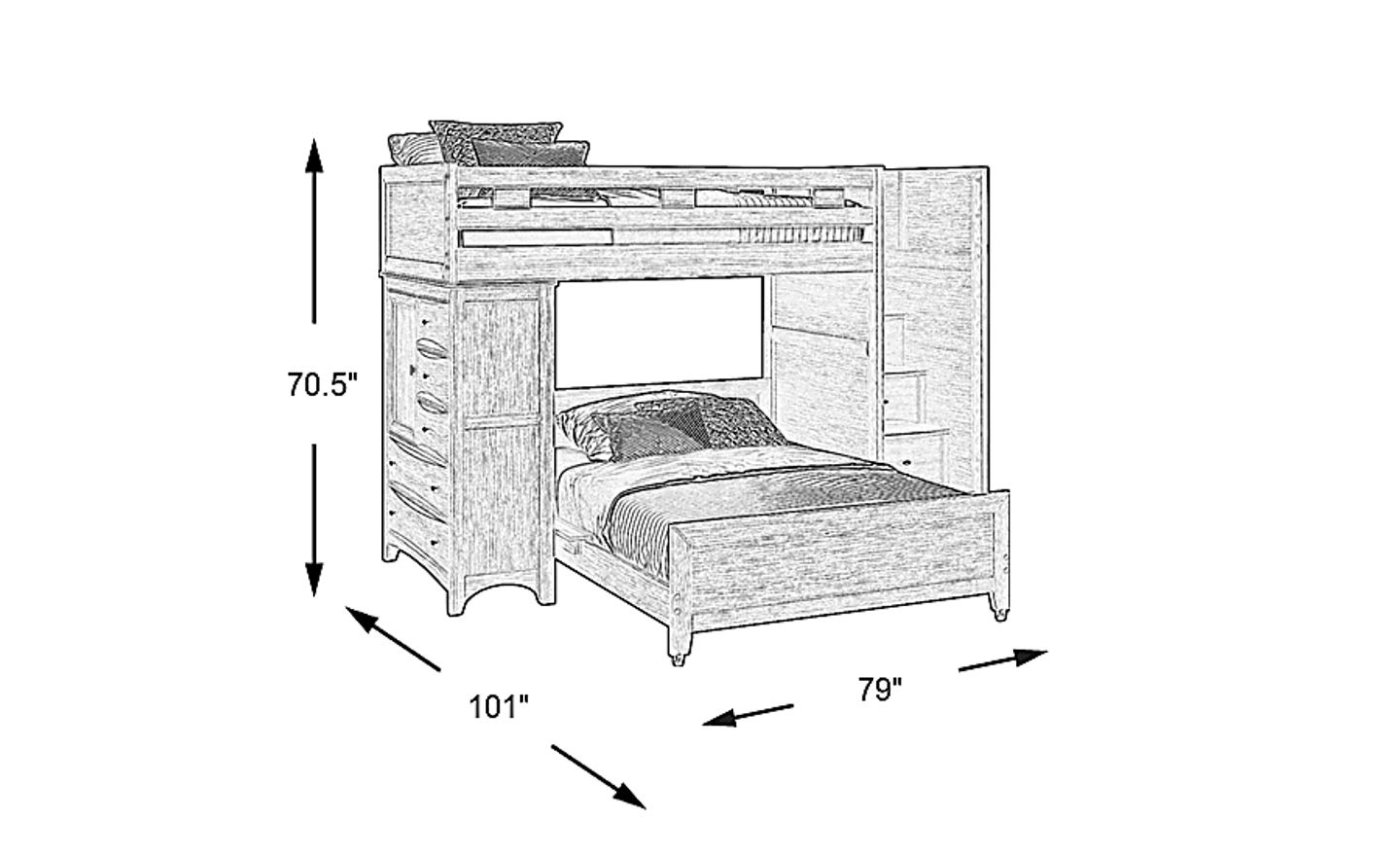Designed as a comprehensive "room solution," this loft bed is ideal for maximizing square footage in smaller suburban homes or urban apartments. It integrates a twin-size elevated bed, a mobile full-size bottom bed on casters, a five-drawer storage chest with adjustable shelves, and additional drawers built into the steps. By combining sleep, storage, and a staircase into a single 101-inch-long unit, it eliminates the need for a separate dresser and second bed frame.