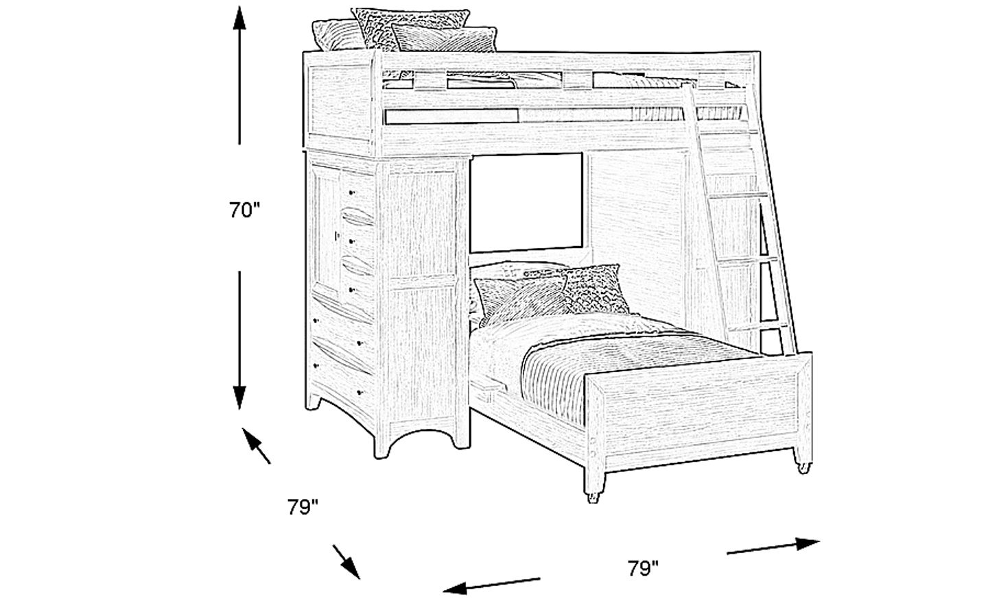 With a height of approximately 70 inches, this loft bed is designed to fit comfortably under standard 8-foot ceilings while still providing ample clearance for the bottom sleeper. Its total footprint of 79" x 79" makes it a high-efficiency piece for urban living, as it combines two beds, two chests, and adjustable shelving into a single area, effectively reclaiming valuable square footage for play or study.