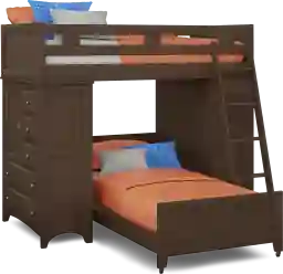 The Ivy League 2.0 loft makes the most of the space in your child's bedroom. On each side you'll find a storage chest with five beveled drawers and brushed steel hardware and adjustable shelves fronted by a door. The twin bottom bed is on casters so it can be moved easily. Durable construction is complemented by a beautiful walnut finish. Mattress and foundation (if required) sold separately. Bunkie board required.