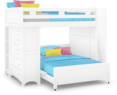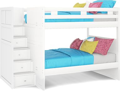 Smart, space saving design gives the Ivy League twin over twin step loft great appeal. You'll love the combined value of having a built-in chest with beveled drawers and brushed steel hardware, steps with storage drawers, a built-in bookcase adds to the storage. For safety, each step has skid resistant textured strips. Quality constructed with veneers in a white finish, this is a timeless choice. The twin bed at the bottom is on casters so it can be moved easily. Mattresses and foundations (if required) sold separately. Bunkie boards required.
