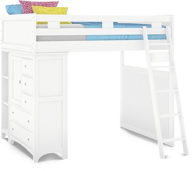 The Ivy League full loft offers a wonderful combination of classic charm and space saving design. One side of the loft has a storage chest with five bevel edged drawers with brushed steel pulls and adjustable shelves behind a single door; the other side has a built-in ladder. All components are finished in fresh white. Mattress and foundation (if required) sold separately. Bunkie board required.