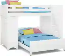 The Ivy League twin over full step loft makes the most of the space in your child's bedroom. On one side you'll find a storage chest with five beveled drawers and brushed steel hardware and adjustable shelves fronted by a door. The opposite side has steps that lead to a twin top bunk. Each step has skid resistant textured strips and built-in storage drawers. The full bottom bed is on casters so it can be moved easily. Durable construction is complemented by a beautiful white finish. Mattresses and foundations (if required) sold separately. Bunkie boards required.