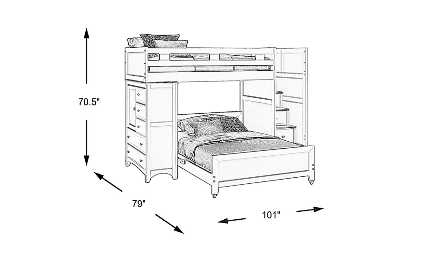 The Ivy League twin over full step loft makes the most of the space in your child's bedroom. On one side you'll find a storage chest with five beveled drawers and brushed steel hardware and adjustable shelves fronted by a door. The opposite side has steps that lead to a twin top bunk. Each step has skid resistant textured strips and built-in storage drawers. The full bottom bed is on casters so it can be moved easily. Durable construction is complemented by a beautiful white finish. Mattresses and foundations (if required) sold separately. Bunkie boards required.