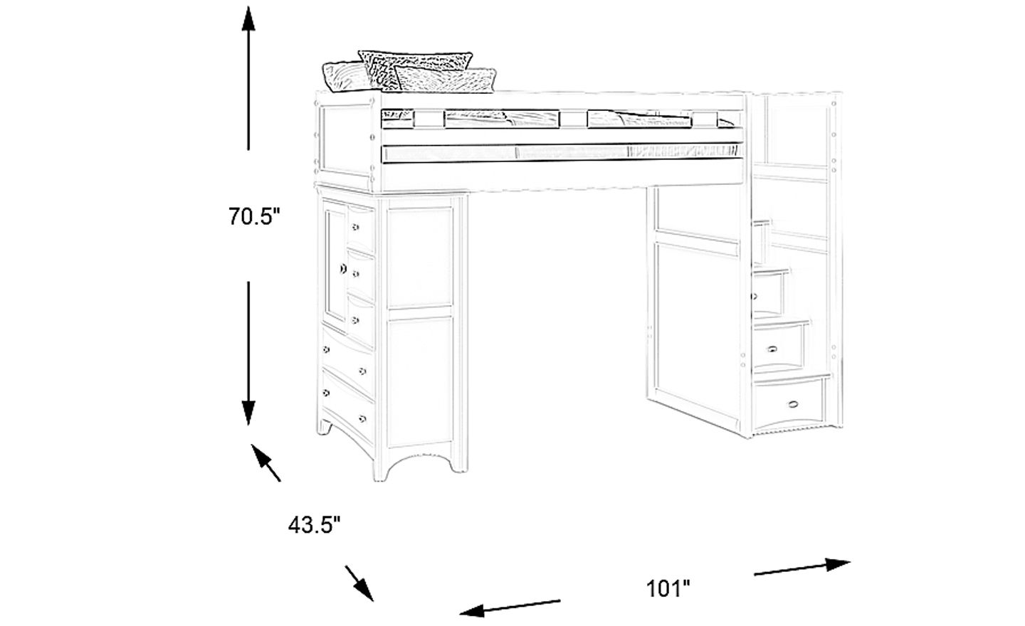 This space-saving "loft/chest" style is ideal for compact urban apartments or smaller suburban bedrooms. By elevating the twin bed and building a five-drawer chest directly into the frame, it consolidates a sleeping area and primary clothing storage into a single 101-inch footprint, freeing up valuable floor space for play or other furniture.