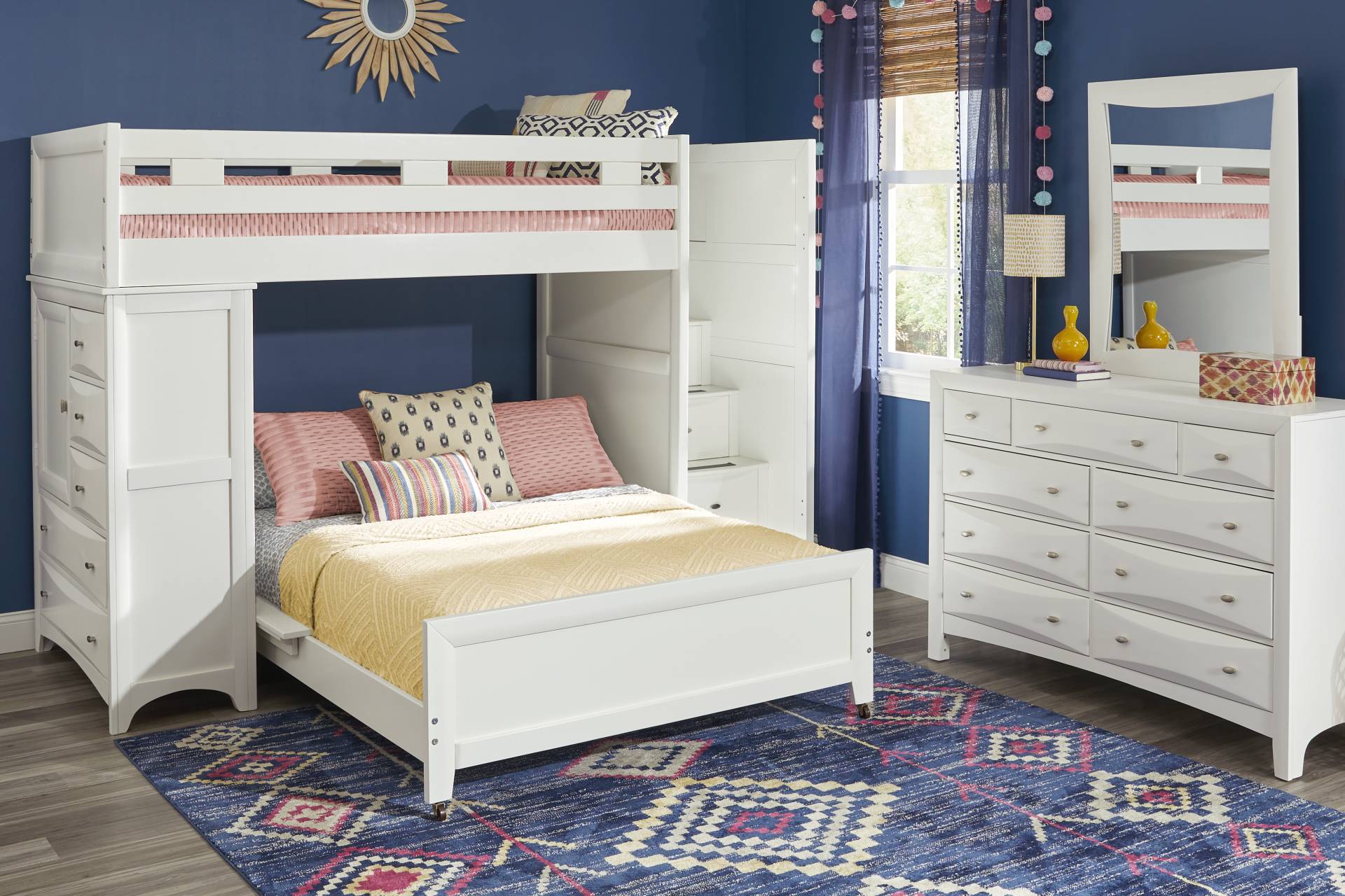The Ivy League twin over twin step loft makes the most of the space in your child's bedroom. On one side you'll find a storage chest with five beveled drawers and brushed steel hardware and adjustable shelves fronted by a door. The opposite side has steps that lead to a twin top bunk. Each step has skid resistant textured strips and built-in storage drawers. The twin bottom bed is on casters so it can be moved easily. Durable construction is achieved with wood solids and veneers and a beautiful white finish. Mattresses and foundations (if required) sold separately. Bunkie boards required.