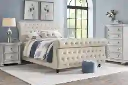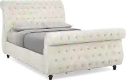 While the sleigh silhouette is a timeless classic, this specific bed is an inspired contemporary interpretation. The use of crisp white upholstery and clean button tufting replaces the heavy, ornate carvings of traditional wood versions. The addition of dark bun feet adds a sophisticated, modern contrast, making it an ideal centerpiece for a transitional or modern bedroom suite.