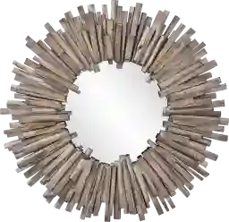 Inspired by coastal driftwood designs, the Izamar mirror features layers of wood pieces hand applied into a round frame surrounding quality clear mirrors. The varying lengths of wood slats are finished with and aged gray wash. D-rings are affixed to the back of the mirror so it is ready to hang right out of the box.