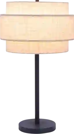 This table lamp features a unique three-layered linen fabric shade designed to provide sophisticated ambient lighting. The tiered construction serves to softly diffuse light across multiple levels, eliminating harsh glares and creating a warm, inviting glow. This makes it an excellent choice for living rooms or bedrooms where a relaxed, layered atmosphere is desired over intense, direct task lighting.