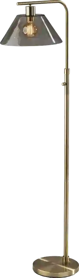 Brighten your space in stunning vintage style with the Jacelyn Point floor lamp. An antique brass finish dominates this piece, from the 10 diameter round base to the slender curving stem and arm. Suspended from the arm is an inverted cone-shaped smoked glass shade that leaves the 60W bulb visible. For a distinctive vintage look, an Edison bulb not included is recommended. The lamp is easily operated by a rotary switch discreetly located on the stem. Partial assembly may be required.
