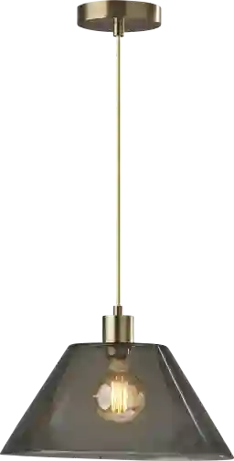 Brighten your space in stunning vintage style with the Jacelyn Point pendant. With a 6ft. beige fabric-covered cord connecting the glass shade to the metal canopy, the height of the light can be adjusted to suit any room regardless of the ceiling height. An antique brass finish dominates this piece, from the 5in. diameter round base to the light socket. Crafted of smoked glass, the inverted cone-shaped shade leaves the 60W bulb visible. For a distinctive vintage look, an Edison bulb (not included) is recommended. Professional installation by an electrician is recommended.