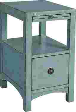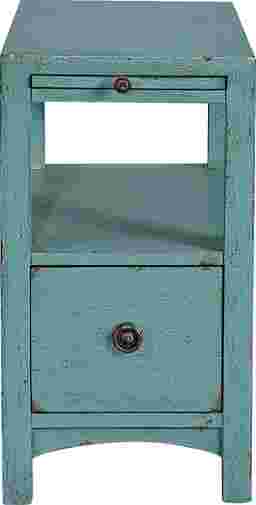 Finished in a peaceful texture blue, this chairside table has personality to spare. Rectangular in design, there is one large bottom drawer, accented with a decorative metal pull. Above that is an open space for display, and directly below the tabletop is an additional surface that can be pulled out as needed. Some assembly required.