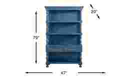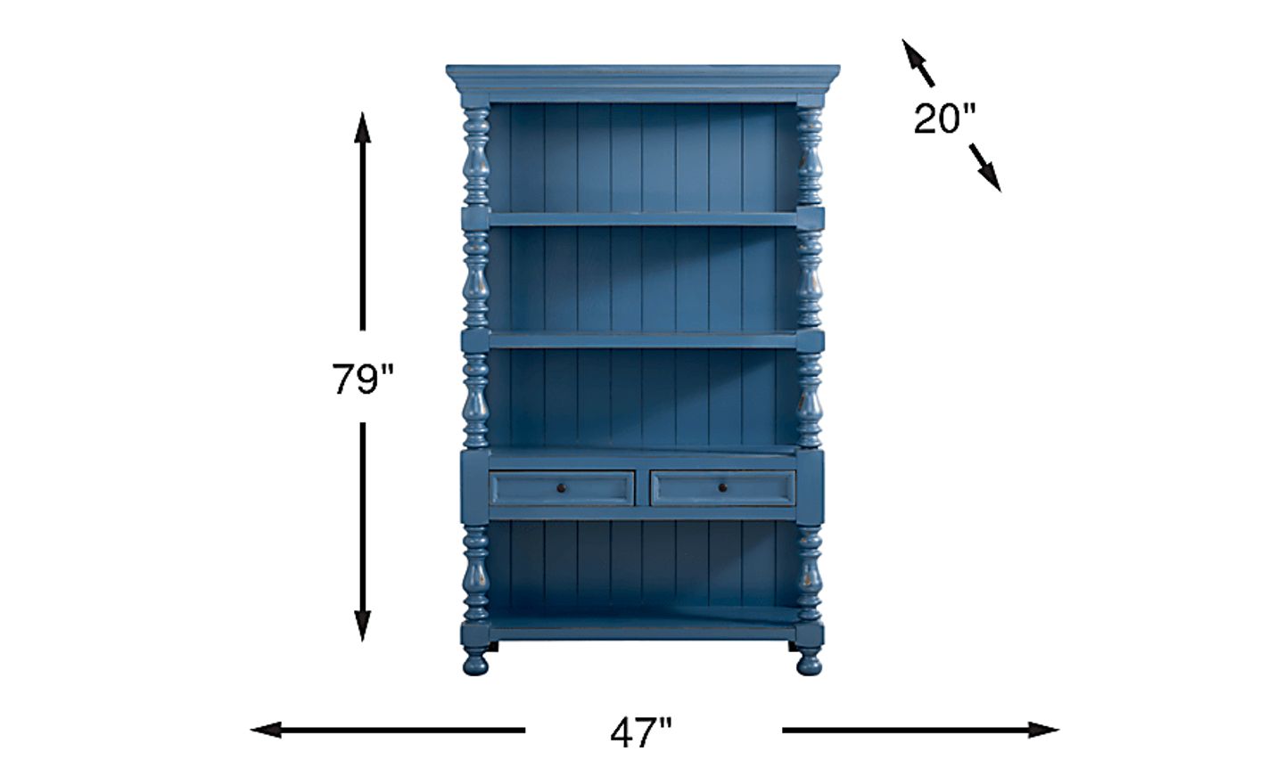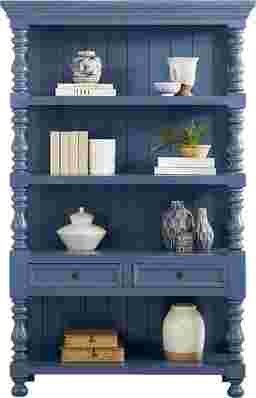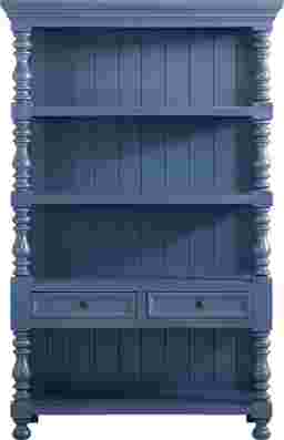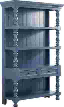 A quiet charm takes shape in the Jaqueline bookcase as treasured ceramics and framed memories find their place on heirloom-worthy shelving. Traditional in style, this beautifully crafted piece features a navy-blue finish with a plank-style back panel and elegant turned posts that frame the silhouette with classic character. Four open shelves offer generous display space for books and decorative items, while two lower drawers provide tucked-away storage for smaller essentials. Dark round knobs and timeless bun feet add a final soft touch.
